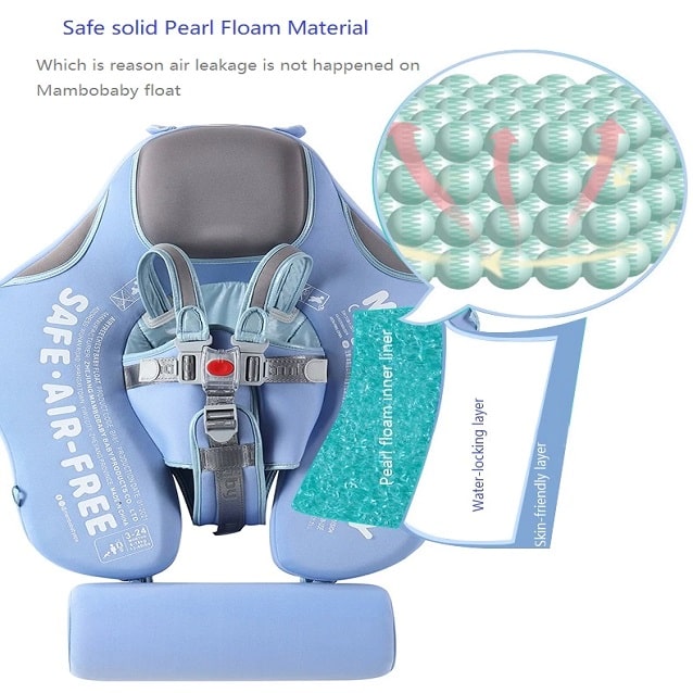 The Mambobaby chest float is made with solid PearlFoam™ (air-free material), so it does not require inflation and cannot leak or deflate.