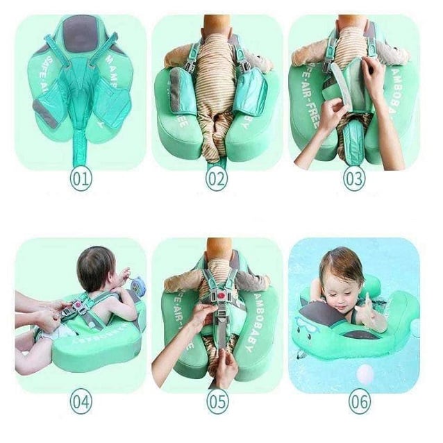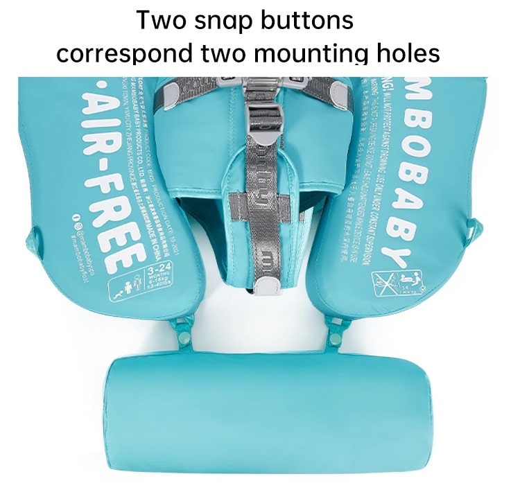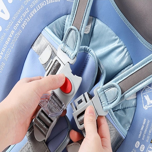 It features a vest-style design with adjustable straps, allowing the baby to float safely on their chest or back while being securely supported.