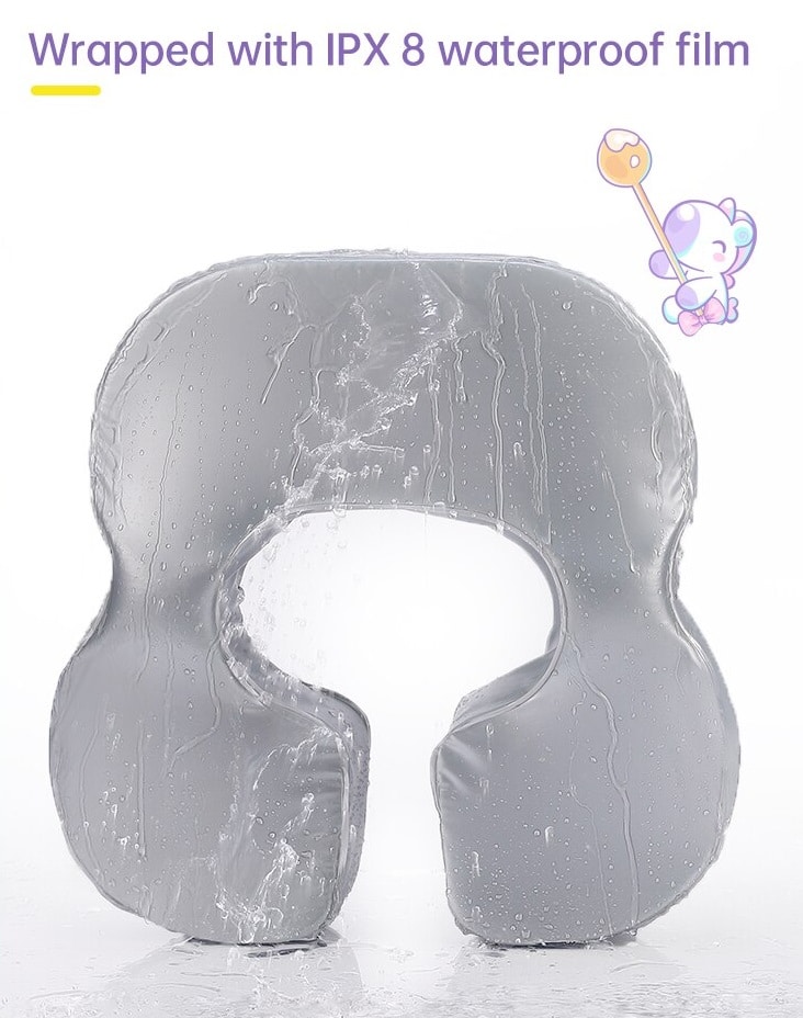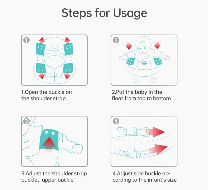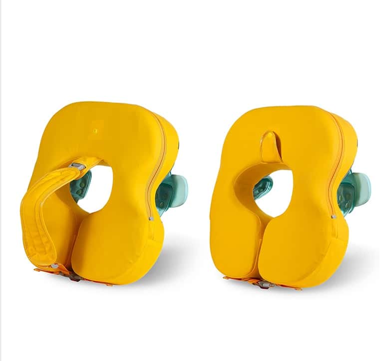 This float is worn around the baby’s chest/underarms, with adjustable shoulder straps and safety buckles to keep the baby securely in place. It uses solid pearl foam (air-free material), so it cannot deflate or leak and is always ready to use.