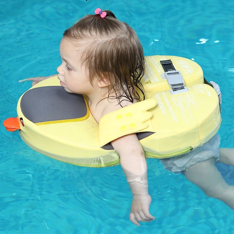 Unlike seat or chest floats, this model keeps babies upright, helping them interact more naturally with water and move their arms freely.